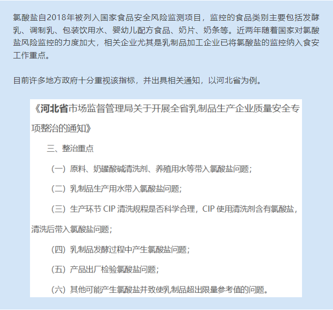 乳品等食品生(shēng)産用(yòng)水(shuǐ)氯酸鹽✔×φ€的(de)風(fēng)險管控